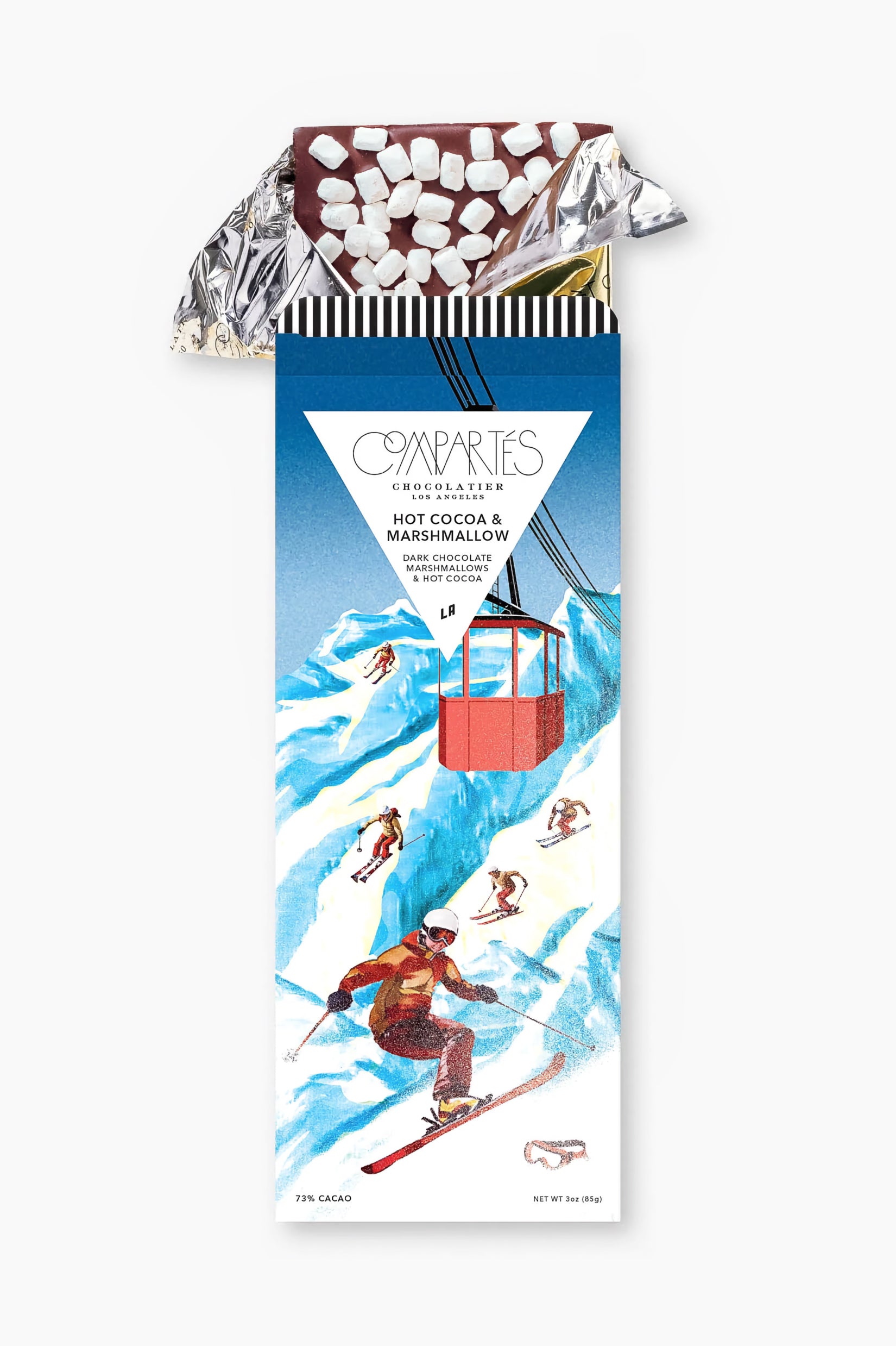 Hot Cocoa + Marshmallow Ingredients: Dark chocolate (cocoa mass, sugar, cocoa butter, soy lecithin as an emulsifier, vanilla), marshmallows (sugar, corn syrup, food starch, contains less than 2% of gelatin, sodium hexametaphosphate, artificial flavor, natural flavor).