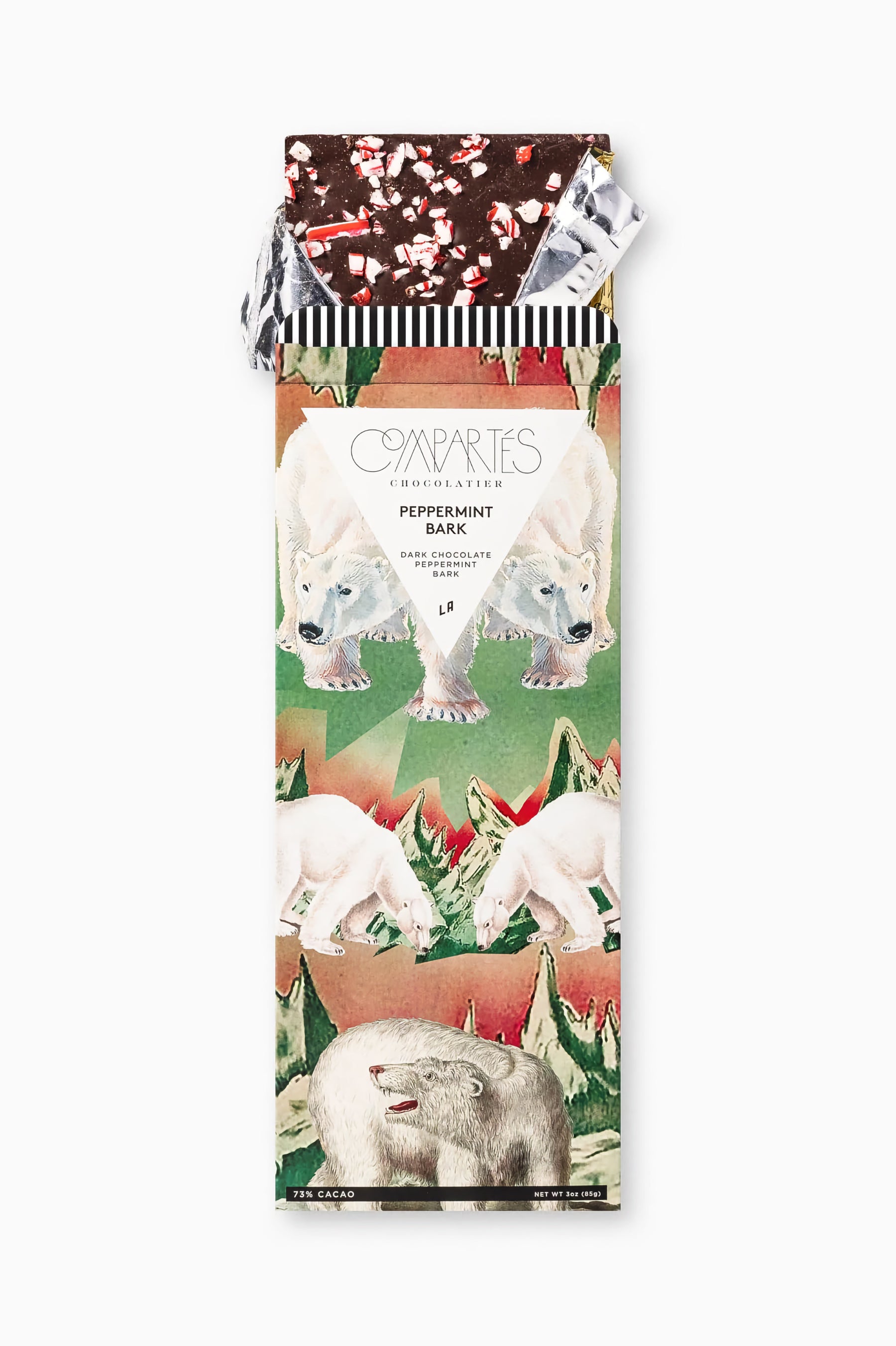 Peppermint Bark Ingredients: Dark chocolate (cocoa mass, sugar, cocoa butter, soy lecithin as an emulsifier, vanilla), pure cane sugar, corn syrup, pure peppermint oil, red 40.