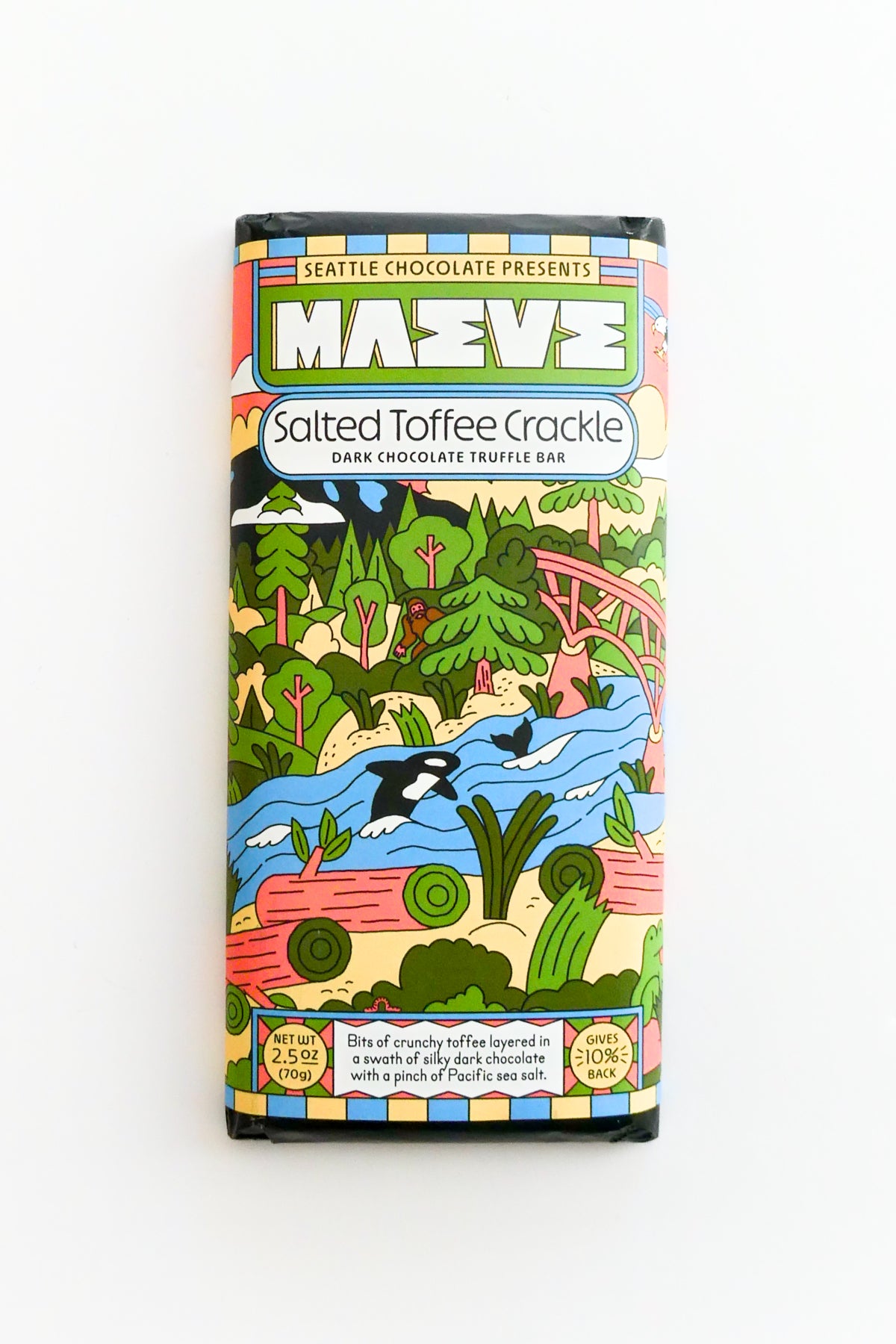 Salted Toffee Crackle Chocolate Truffle Bar Ingredients: Dark chocolate (cocoa mass, cane sugar, cocoa butter, organic soy lecithin, natural vanilla), coconut oil, toffee (beet sugar, glucose syrup, cream, butter, skim milk powder, salt), sea salt.
