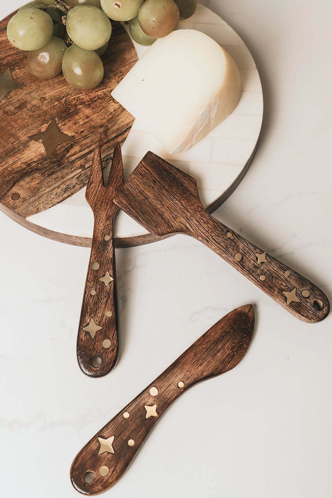 Details: This unique set includes three hand carved, solid wood cheese knives. Each knife features an inlay of gold finish brass stars. The set is tied together for accessible hanging or convenient storage.