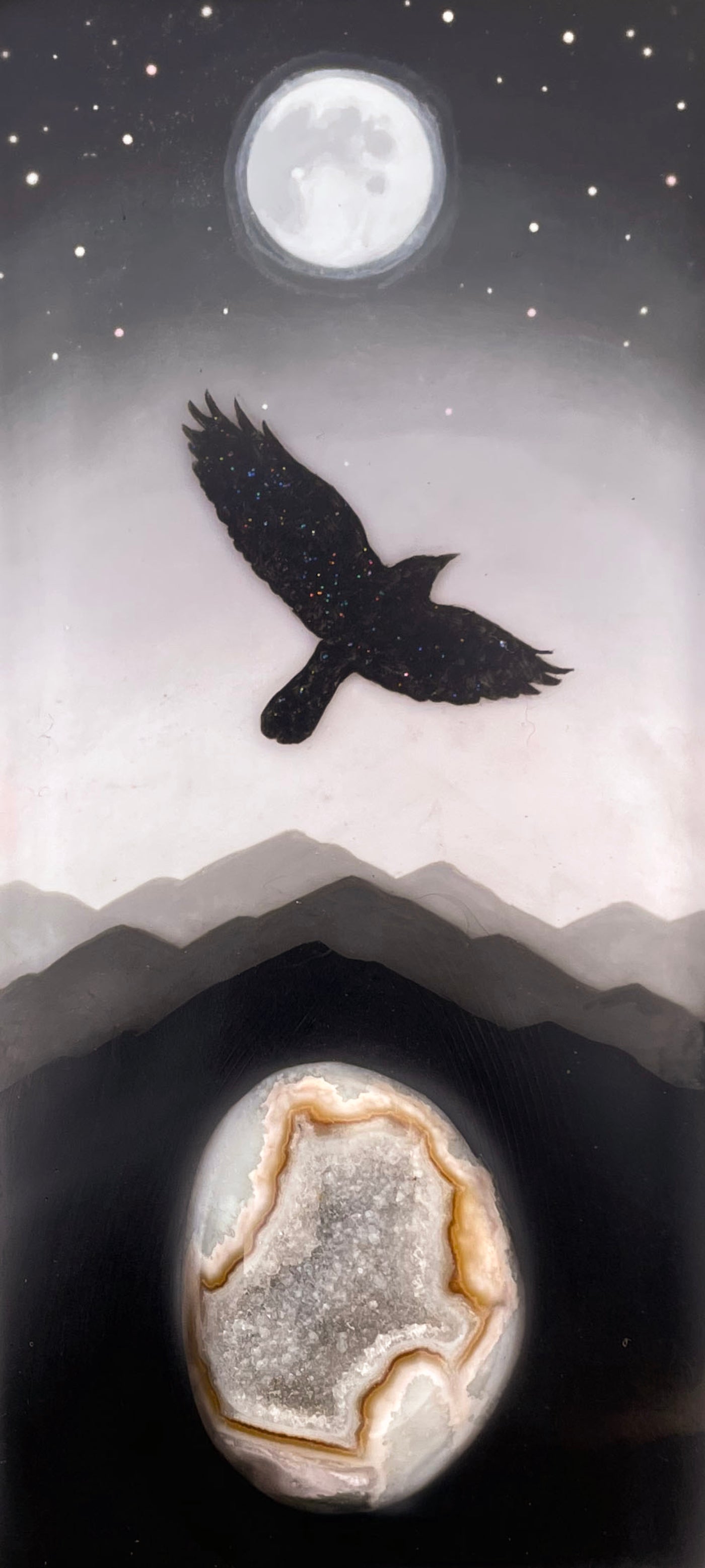 Faryn Davis, of Fernworks, creates dimensional resin landscapes which blend real specimens and minerals with imagery inspired by the natural world. Based in the mountains of Asheville, NC, she blends small hand painted scenes and found specimens such as real grass, lichen, feathers, gemstones, and ethically sourced bones into dimensional resin artwork. Each piece is hand painted with toothpicks and brushes, layered in epoxy, then polished into delicate, dreamlike 3-D landscapes populated by magical symbols, birds, bears, foxes, and other creatures.