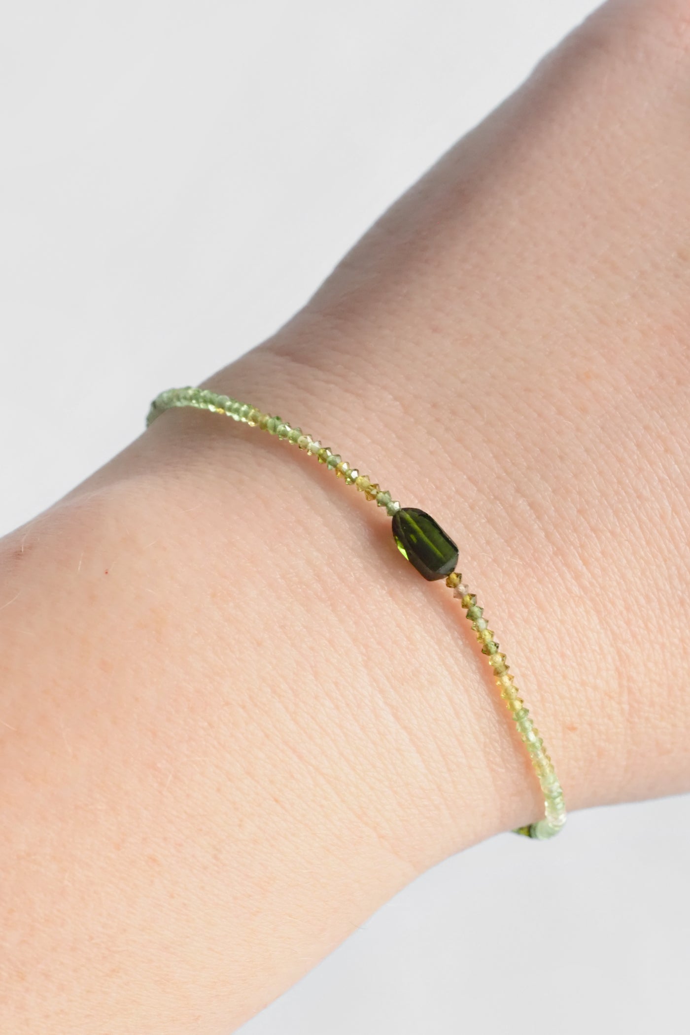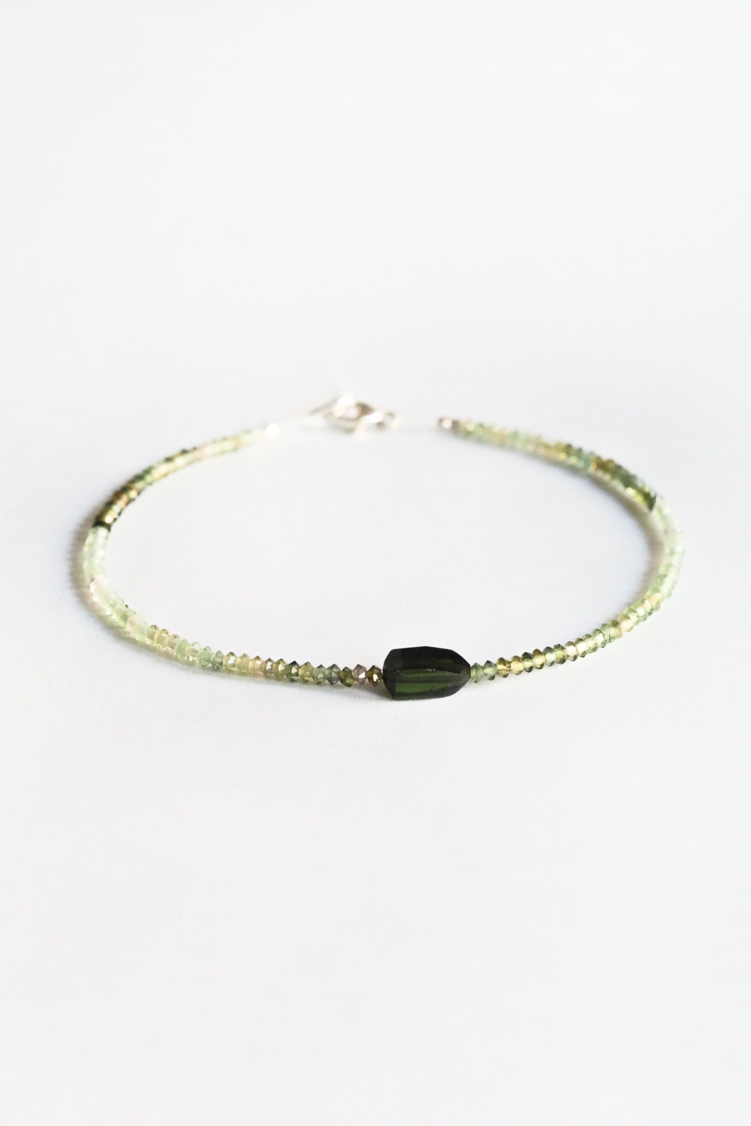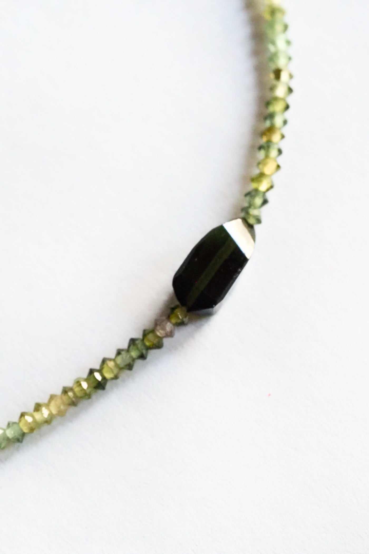 Details: Dozens of ombre tourmaline beads frame a unique green tourmaline bead. Sterling silver lobster clasp