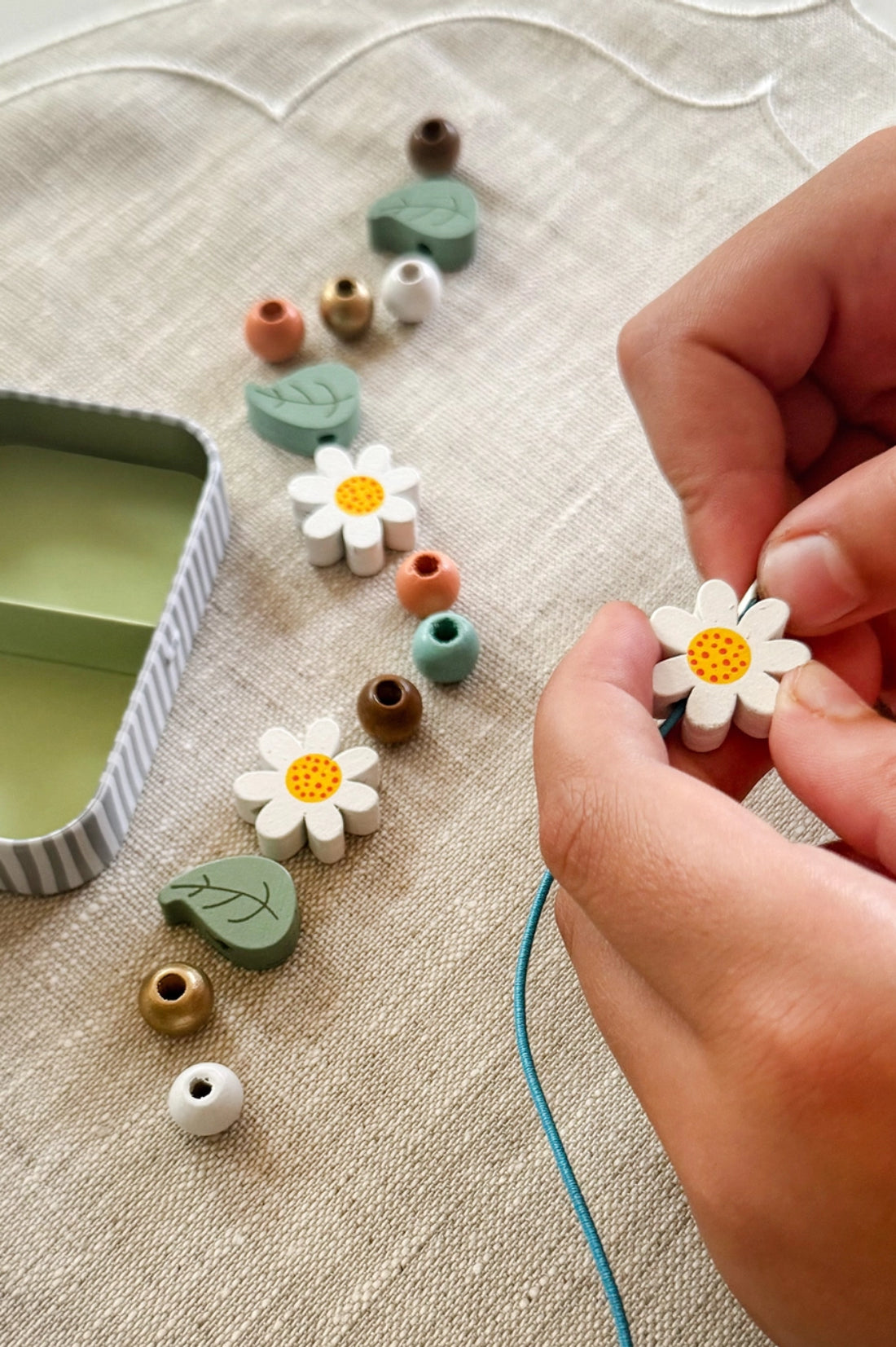 A beautiful gift tin containing elastic & beads to create a sweet bracelet. The elastic comes with hard ends to aid the beading process for young children. Then, patience & precision are all that's required to assemble this piece. The tin can be used to store the bracelet, or a special trinket.