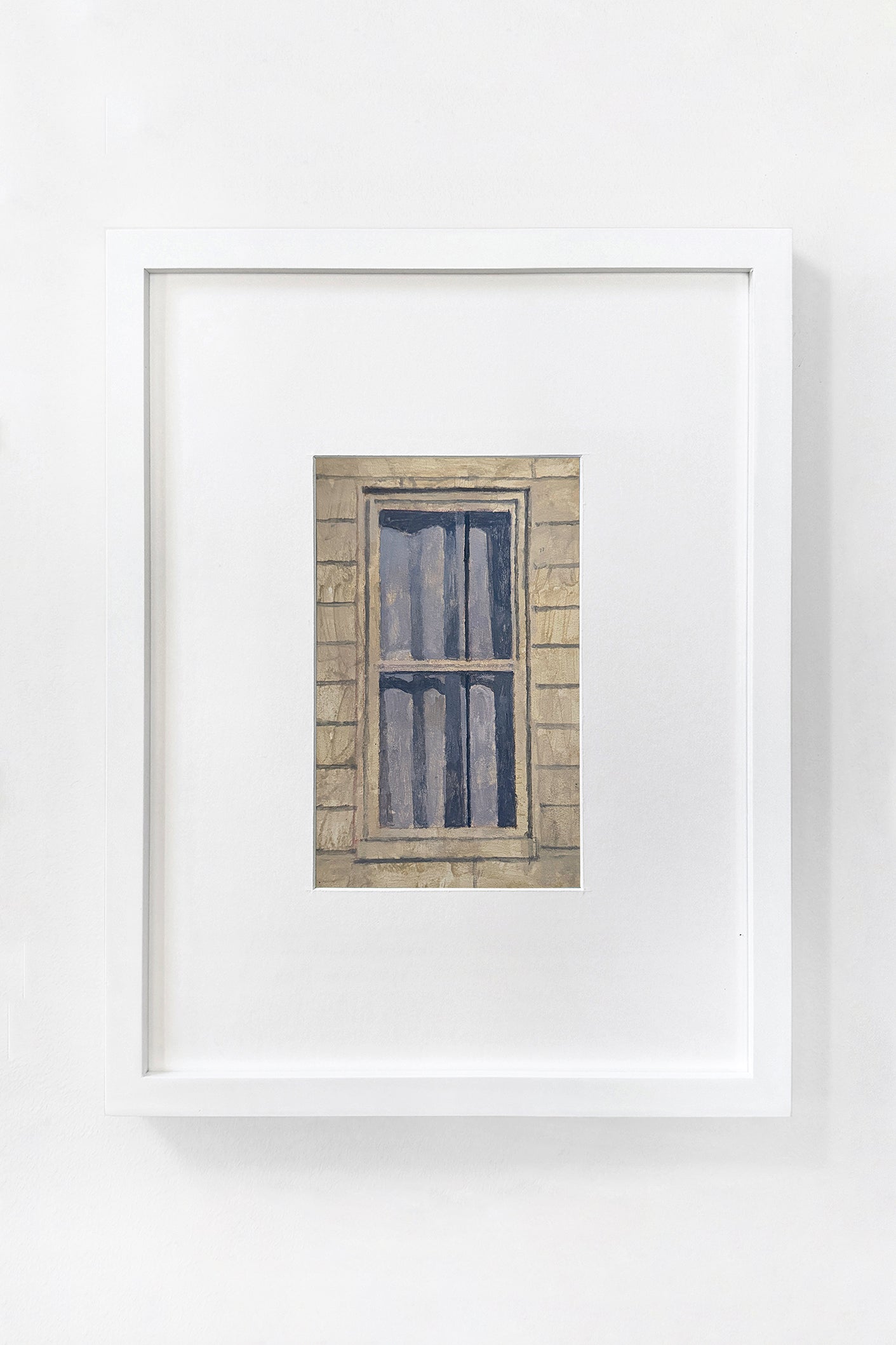 The window paintings, such as Sunday To-Do, are constructed from the vantage point of an intimate, interior space. The works imply the presence of a neighboring apartment building through the window as a parallel experience. Objects with specific emotional weight—books, notes, coffee pots—rest on the windowsill as vestiges of daily life. In the accompanying Threshold Studies, the opposite, exterior vantage point is taken, only revealing small fragments of life or vacancy—a blurred houseplant, a barely opened curtain, a “for-rent” sign in a likely-vacant apartment.