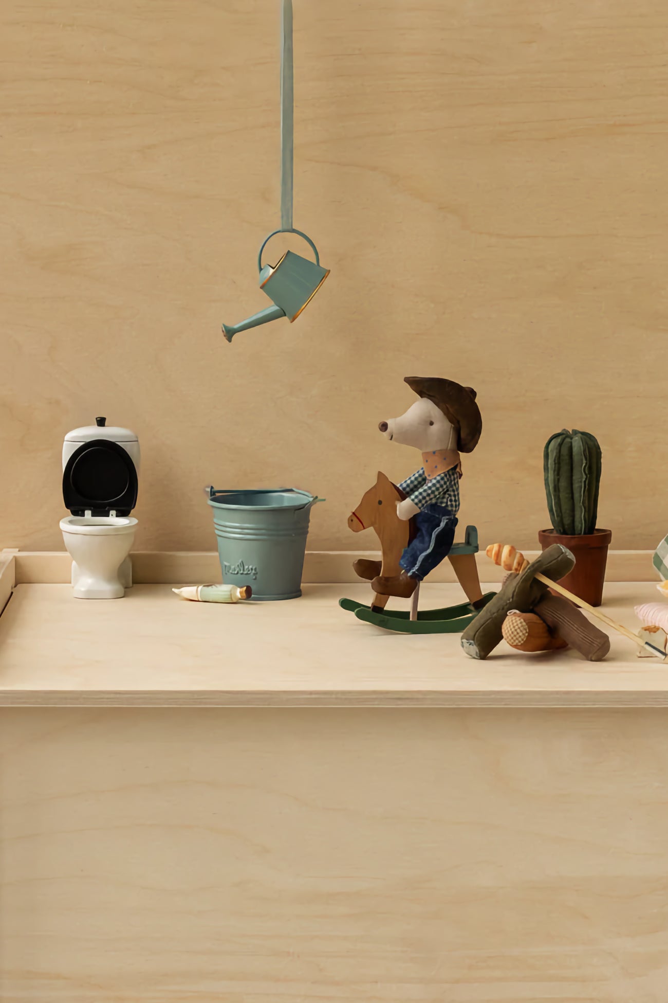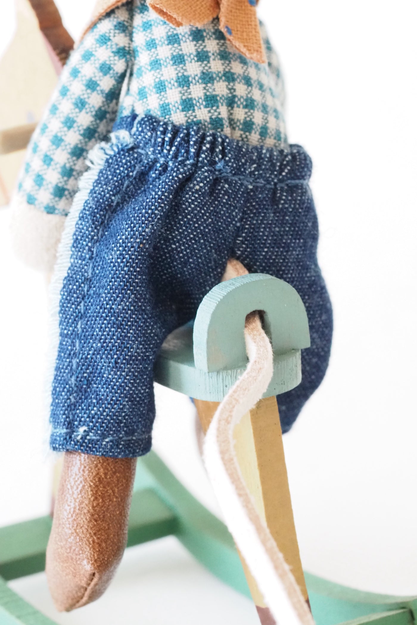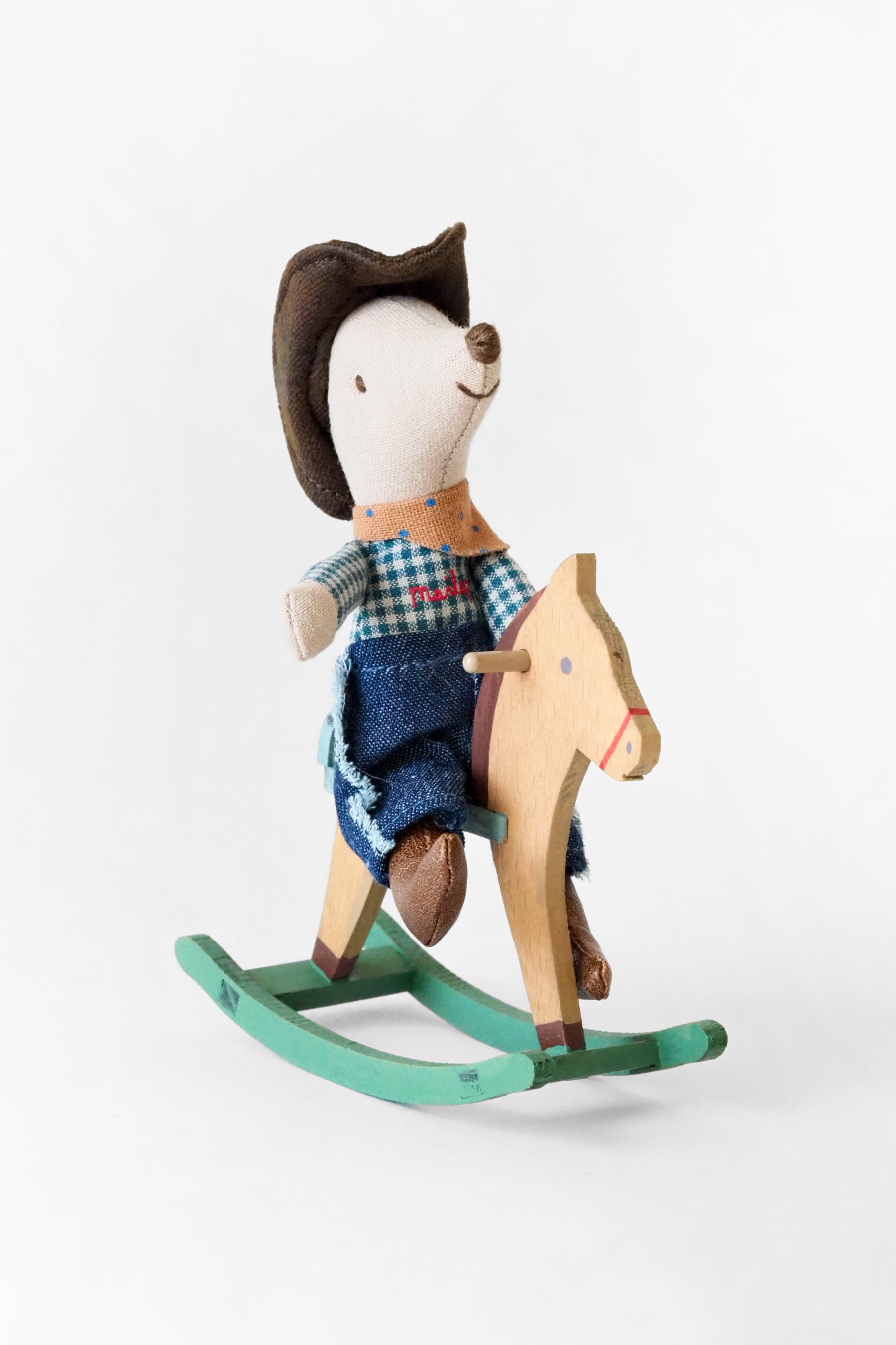 Details: Cowboy Mouse is dressed in tiny blue jeans, a bandana, and a classic cowboy hat - ready to ride off on a rocking horse.