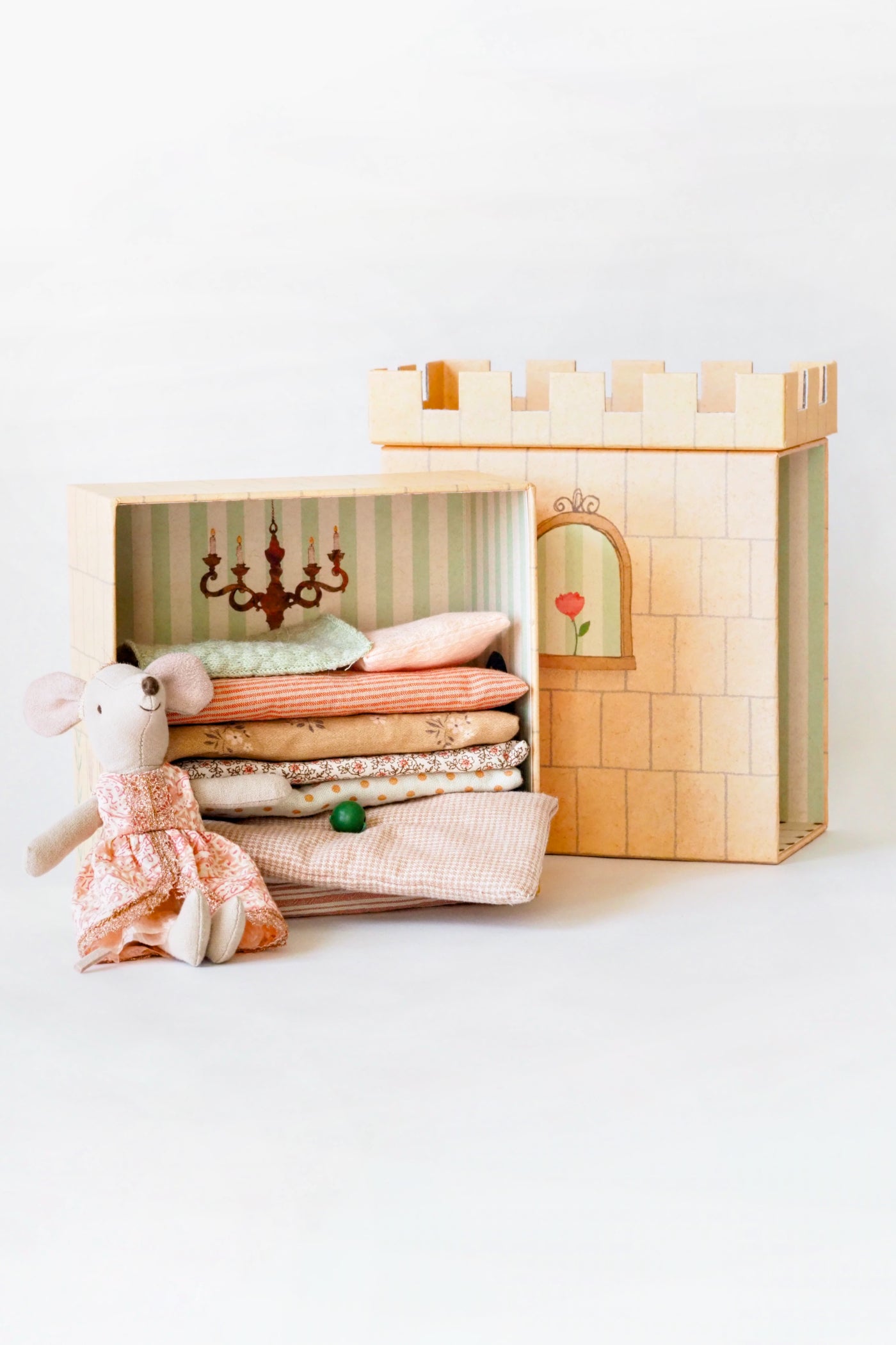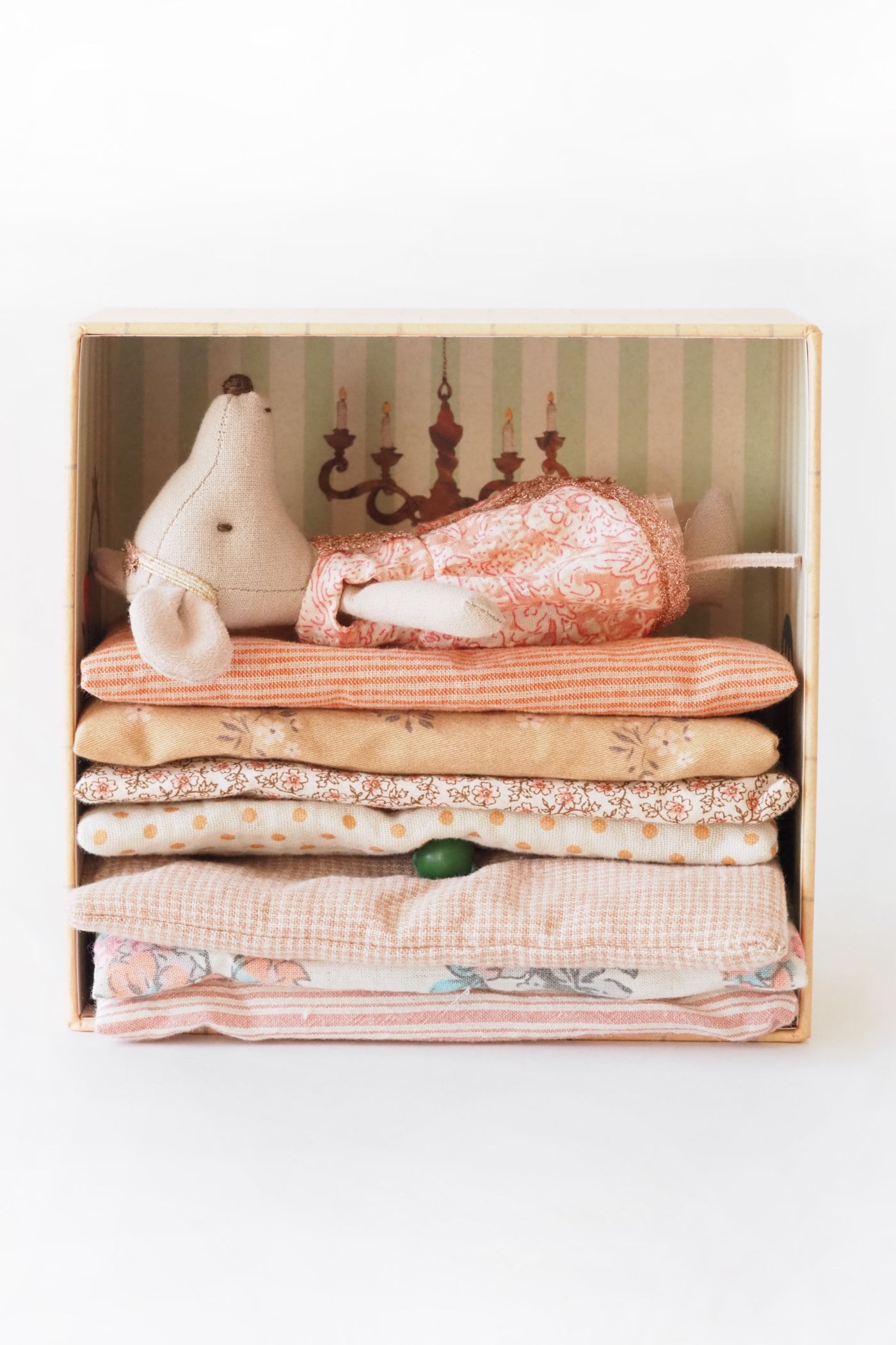 Details: Inside the illustrated castle box, you’ll find a big sister Princess Mouse dressed in an elegant gown, along with a stack of 7 soft mattresses made from different fabrics and the tiniest pea hidden beneath
