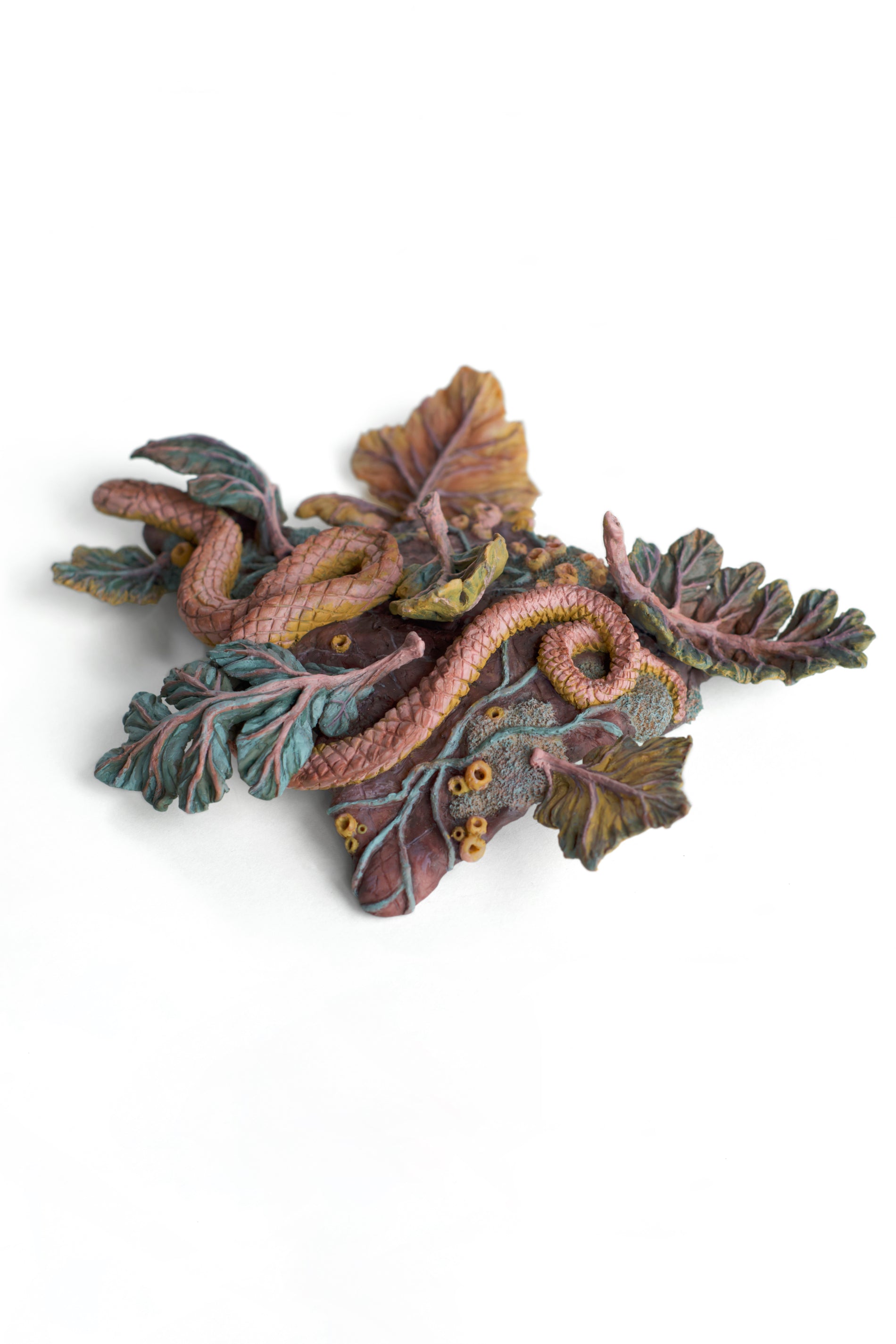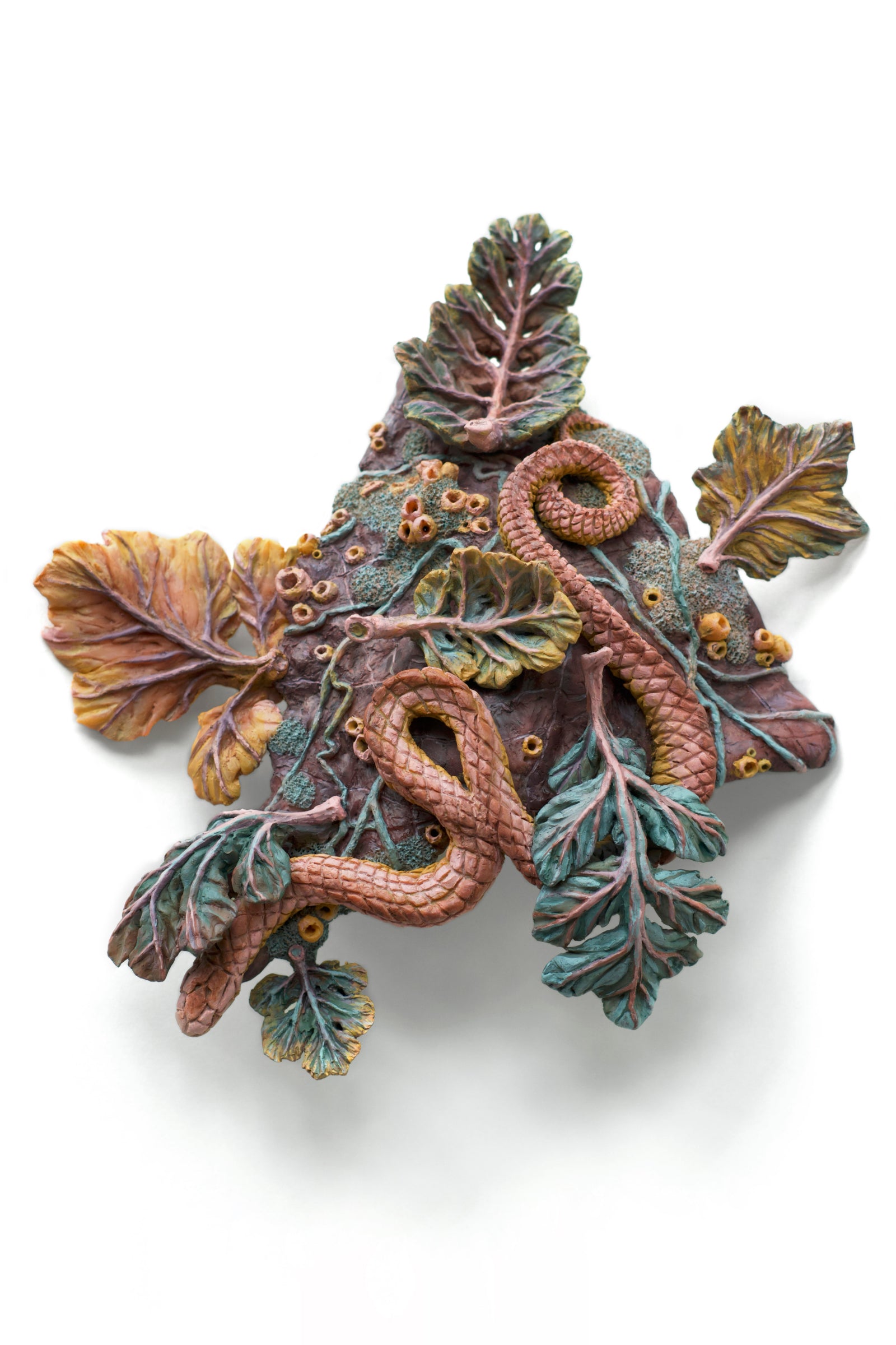 These works are stylized studies of ecology that release my paintings from the square edges of the page into the third dimension. Rendered in clay, these natural scenes provide a high-relief canvas for my painting practice, which relies on vivid, synthetic colors. Emerging from the wall, these sculptures relate to viewers physically in ways my previous works on paper could not.