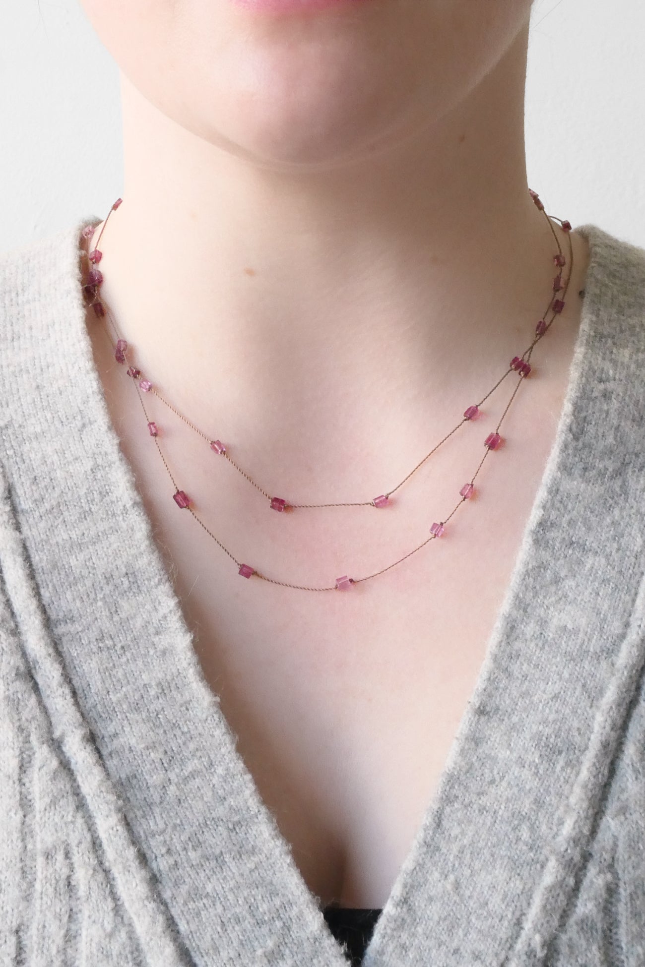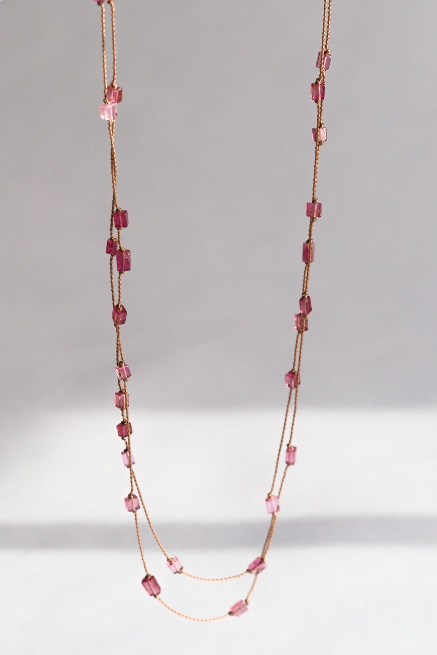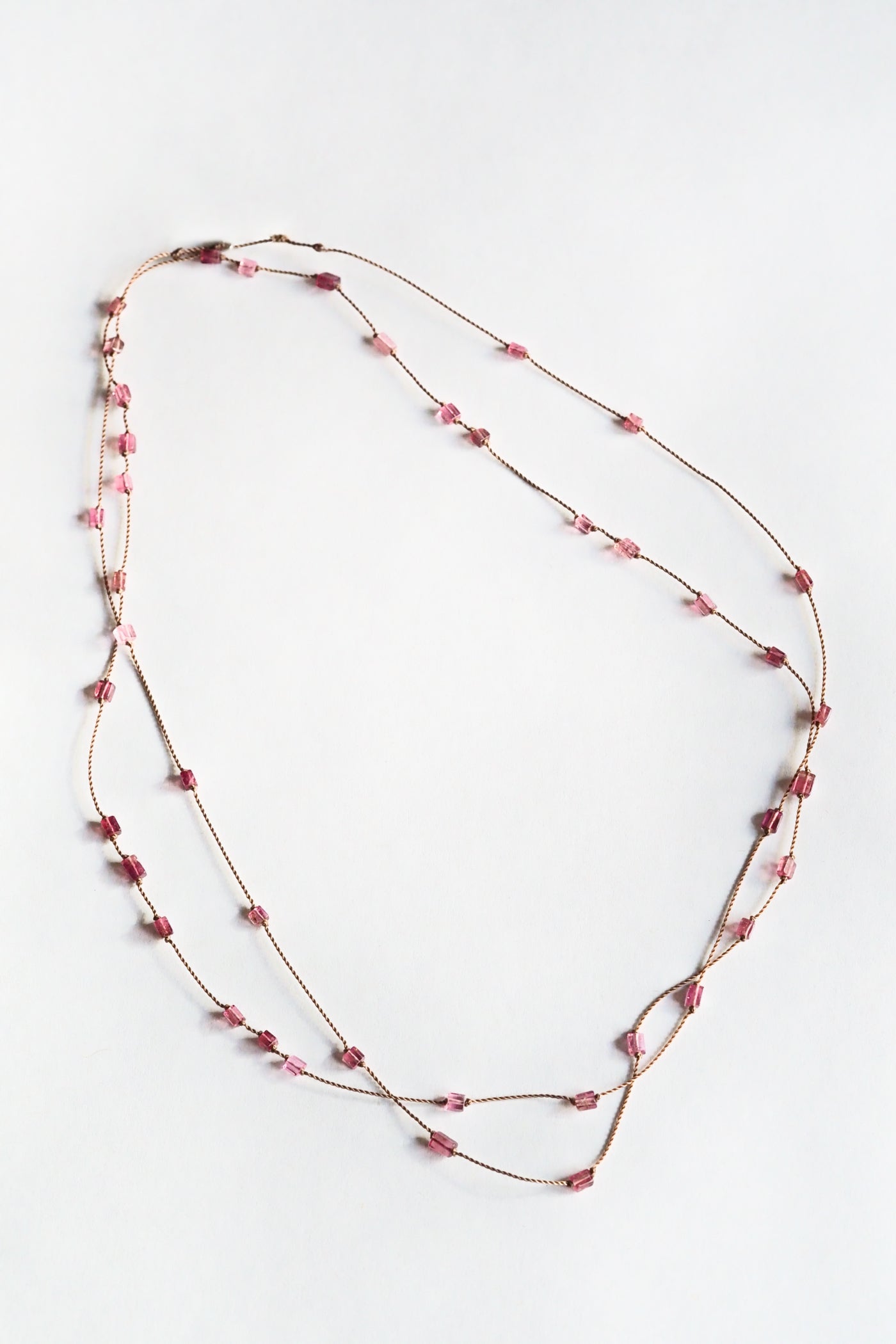 Details: Features 52 faceted pink tourmaline stones dispersed along a long nylon cord, extra long to be worn long or looped twice for a two tier effect.
