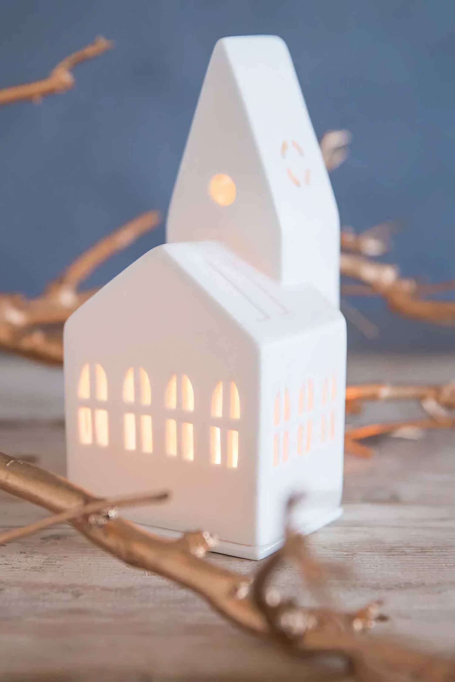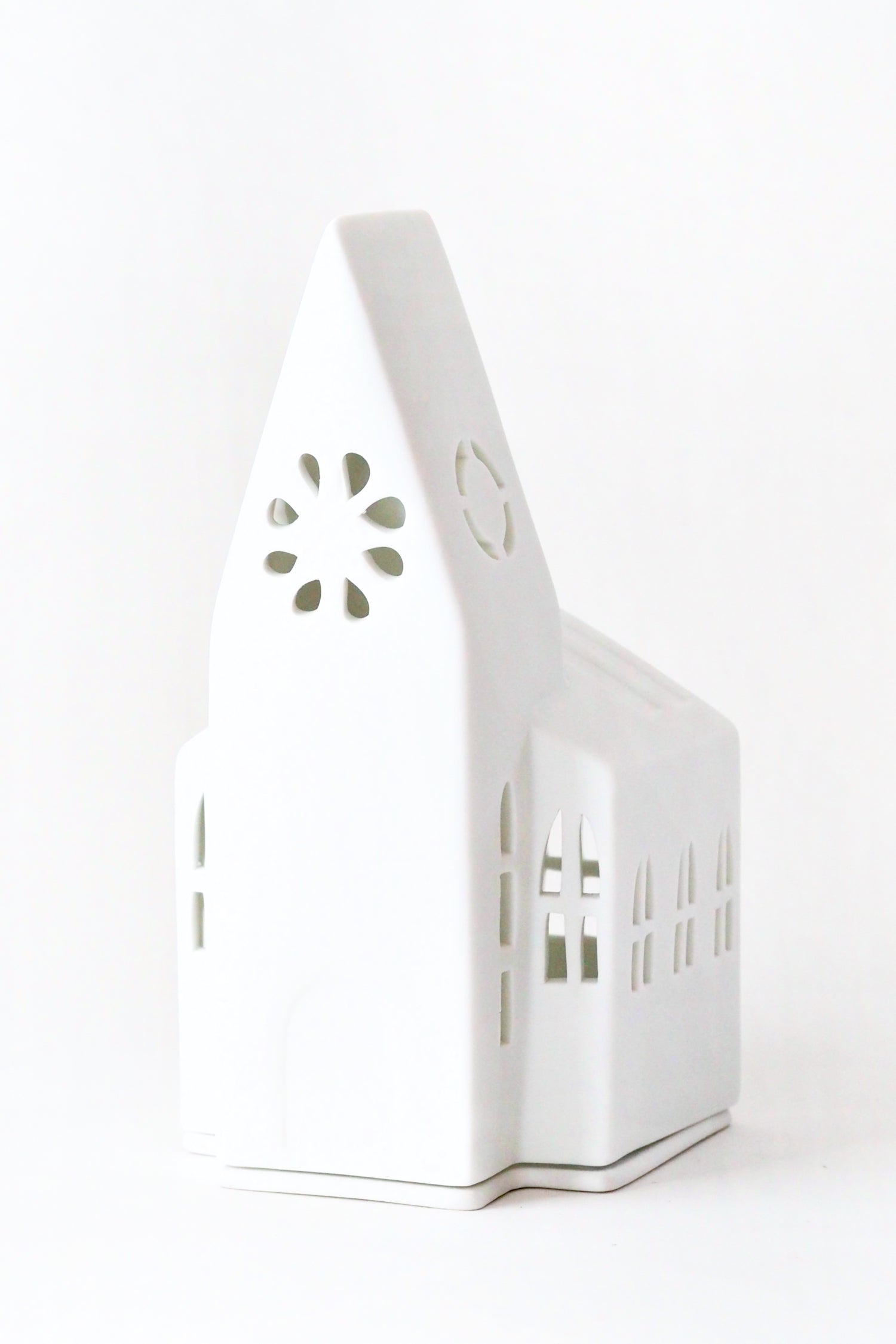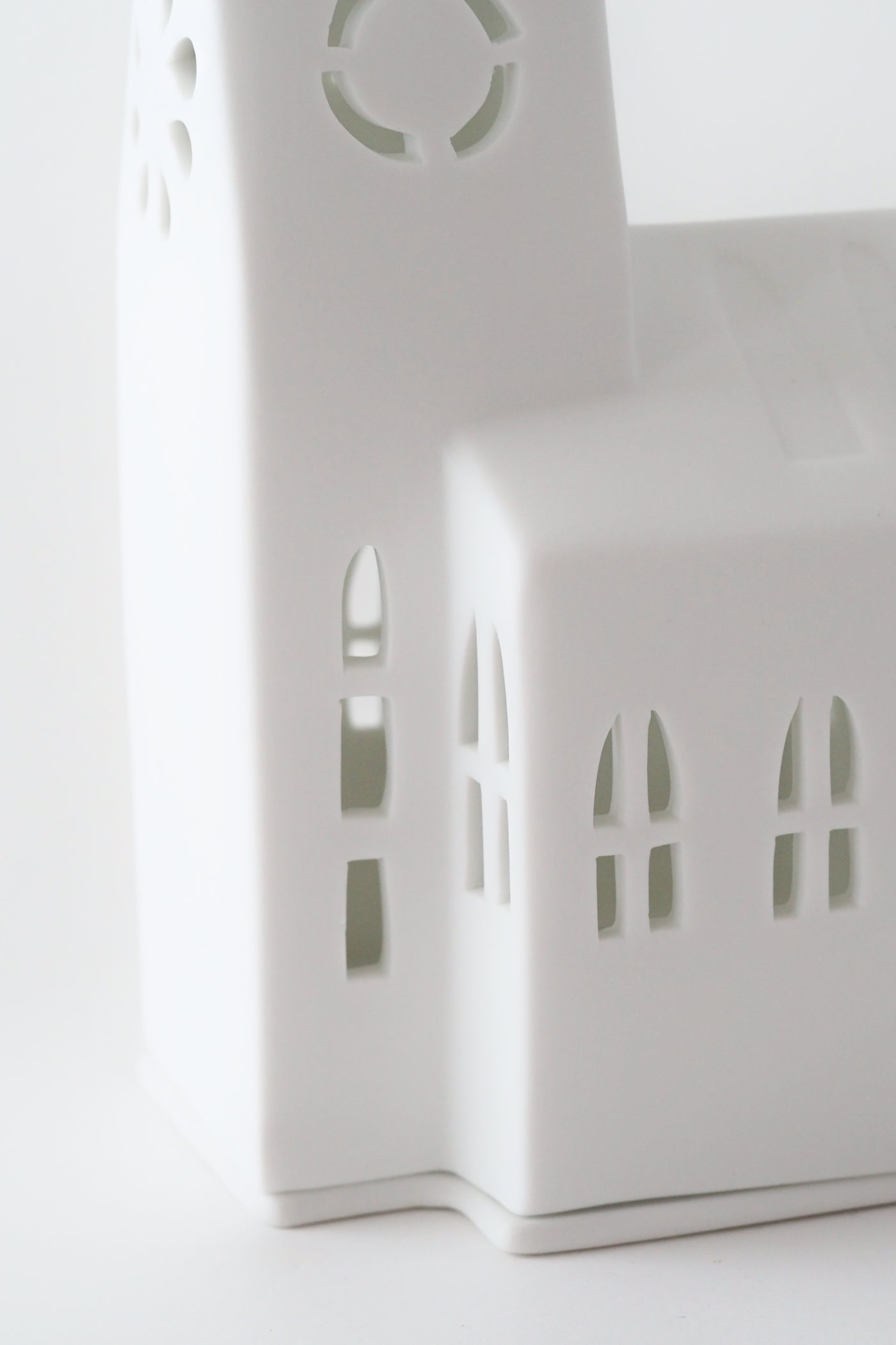 Details: Porcelain base holds light source which will glow through the many windows. Light source not included