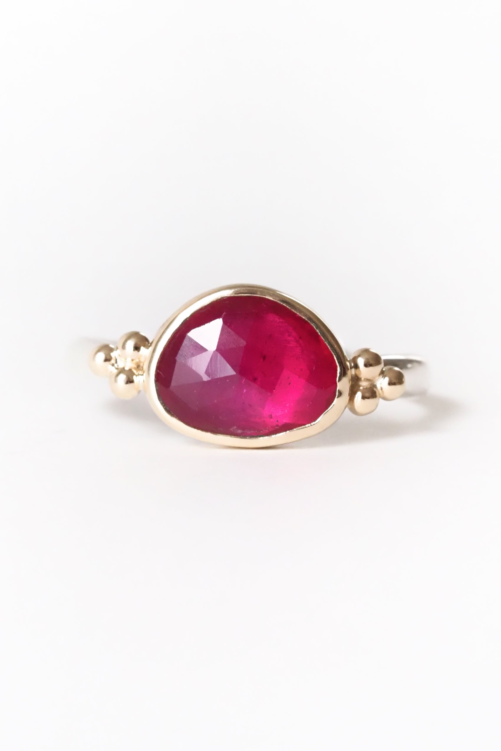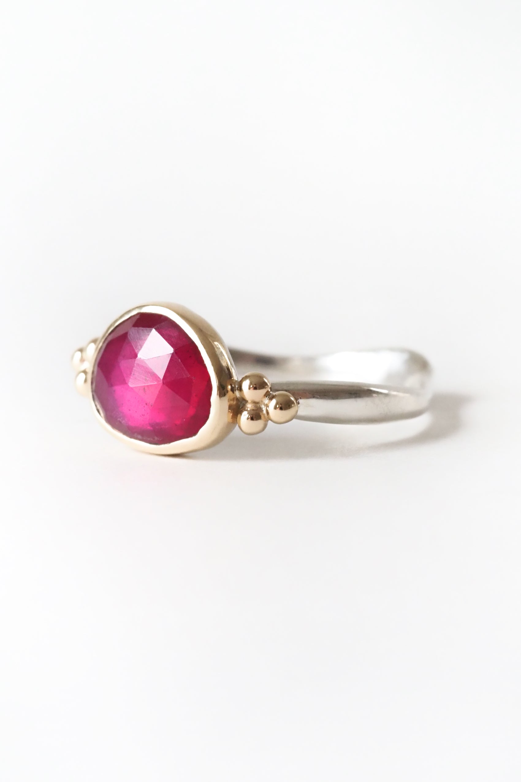 Details: One of a kind ring. The handcarved freeform band is sterling silver and 14k gold setting, with a faceted ruby.