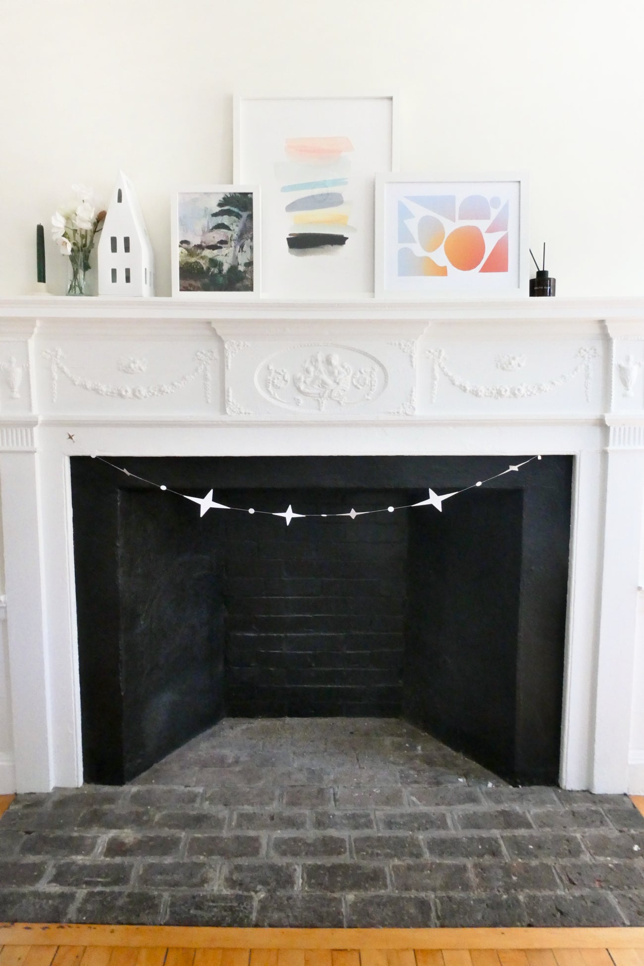 Details: Decorative garland made up of paper stars of various sizes, with a gold star weight on one end.