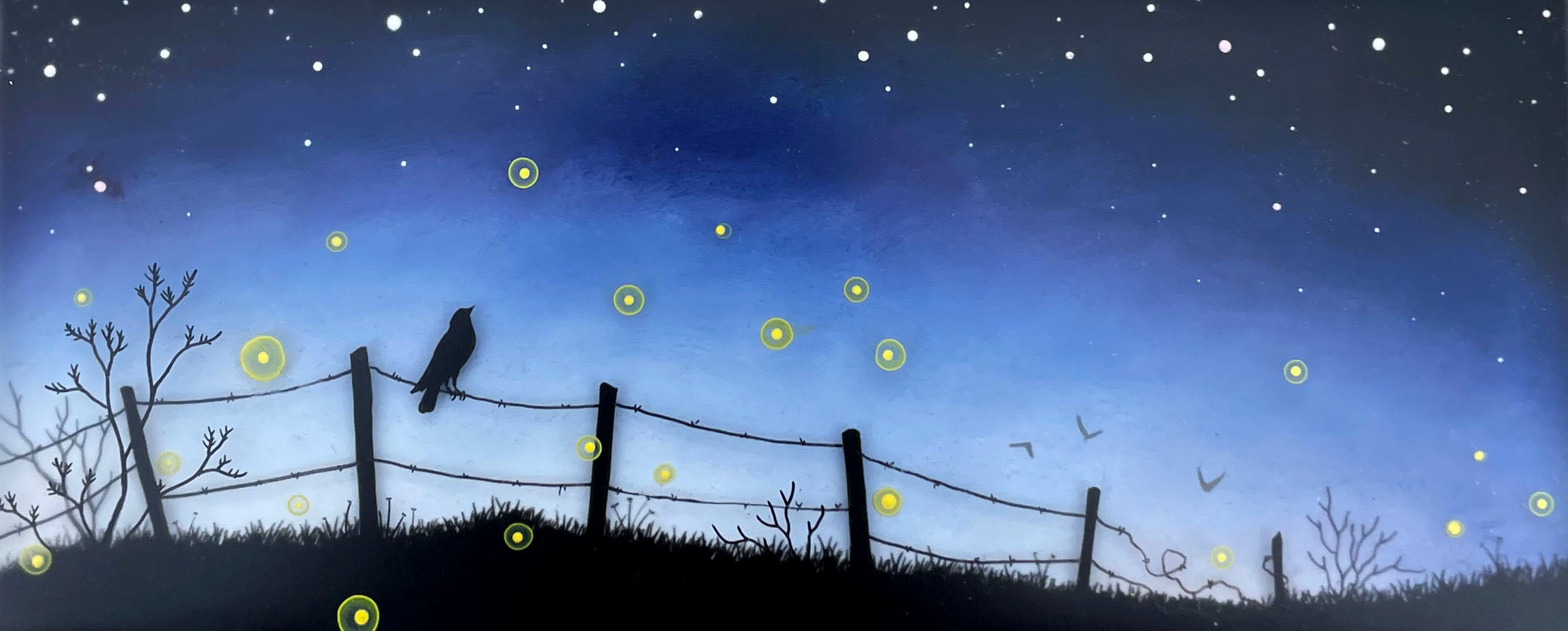 Faryn Davis, of Fernworks, creates dimensional resin landscapes which blend real specimens and minerals with imagery inspired by the natural world. Based in the mountains of Asheville, NC, she blends small hand painted scenes and found specimens such as real grass, lichen, feathers, gemstones, and ethically sourced bones into dimensional resin artwork. Each piece is hand painted with toothpicks and brushes, layered in epoxy, then polished into delicate, dreamlike 3-D landscapes populated by magical symbols, birds, bears, foxes, and other creatures.