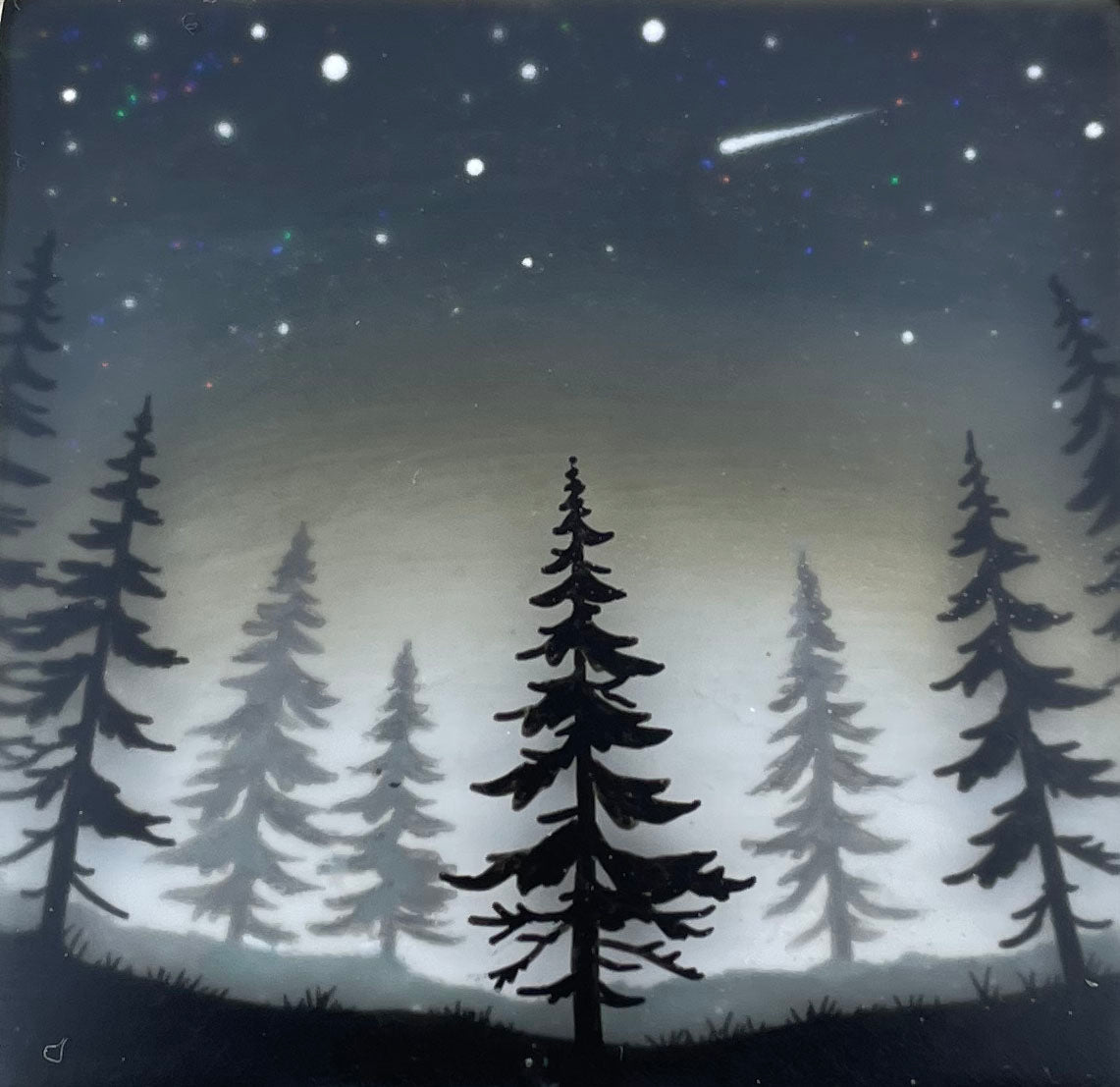 Faryn Davis, of Fernworks, creates dimensional resin landscapes which blend real specimens and minerals with imagery inspired by the natural world. Based in the mountains of Asheville, NC, she blends small hand painted scenes and found specimens such as real grass, lichen, feathers, gemstones, and ethically sourced bones into dimensional resin artwork. Each piece is hand painted with toothpicks and brushes, layered in epoxy, then polished into delicate, dreamlike 3-D landscapes populated by magical symbols, birds, bears, foxes, and other creatures.