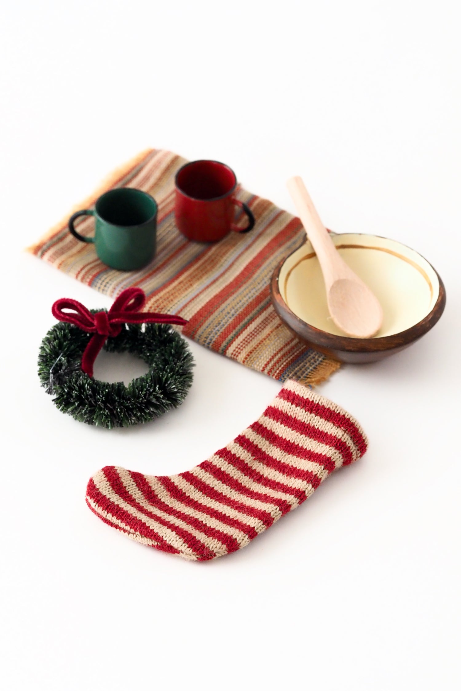 Details: Contains a small stocking, rug, wreath, two cups and a bowl with a wooden spoon. All parts fits into the Gingerbread house and fits for the mouse family.
