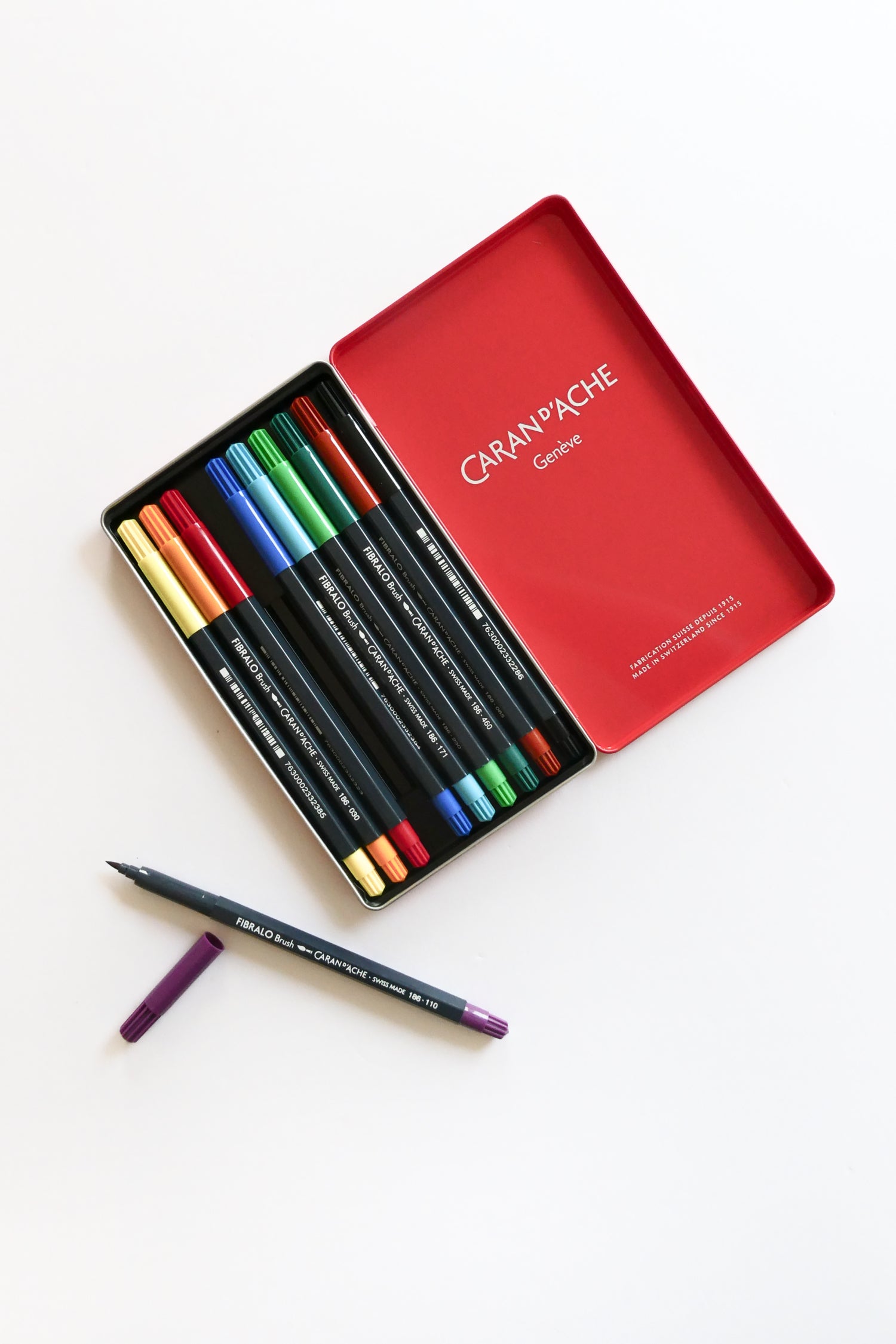 Details: This set of ten brush pens includes one each of Black, Orange, Lemon Yellow, Scarlet, Lilac, Cobalt Blue, Turquoise Blue, Yellow Green, Peacock Green, and Russet.